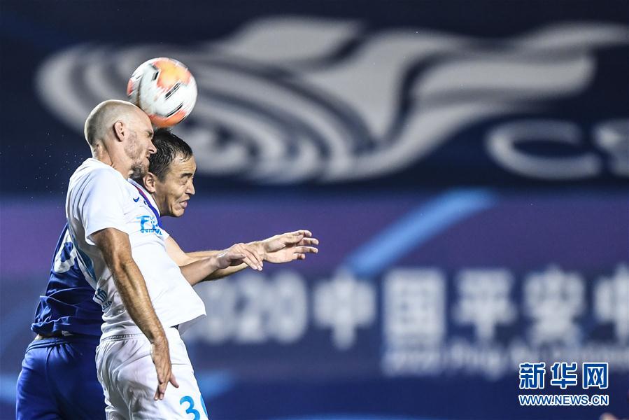 8月10日,上海绿地申花队球员冯潇霆(后)与大连人队球员丹尼尔森在比赛中争顶。 当日,在2020赛季中国足球协会超级联赛第一阶段(大连赛区)第四轮比赛中,上海绿地申花队以2比2战平大连人队。 新华社记者 潘昱龙 摄