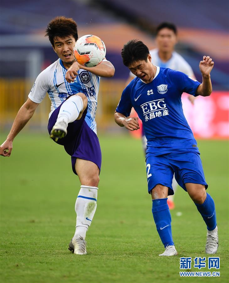 8月11日,天津泰达队球员赵宏略(左)在比赛中拼抢。 当日,在2020赛季中国足球协会超级联赛第一阶段(苏州赛区)第四轮比赛中,天津泰达队以0比3不敌石家庄永昌队。 新华社记者 季春鹏 摄