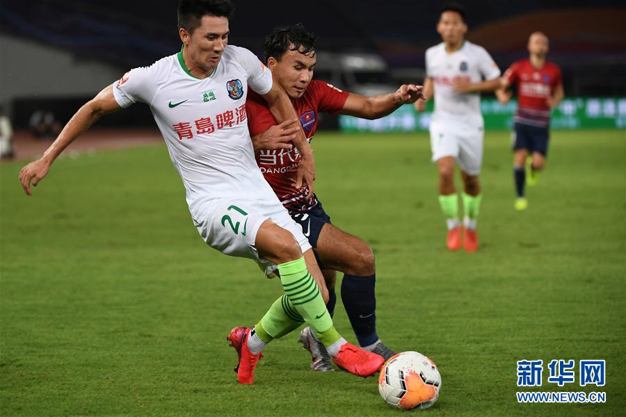 8月11日,青岛黄海青港队球员王伟(左)在比赛中拼抢。 当日,在2020赛季中国足球协会超级联赛第一阶段(苏州赛区)第四轮比赛中,重庆当代队以0比0战平青岛黄海青港队。 新华社记者 韩瑜庆 摄