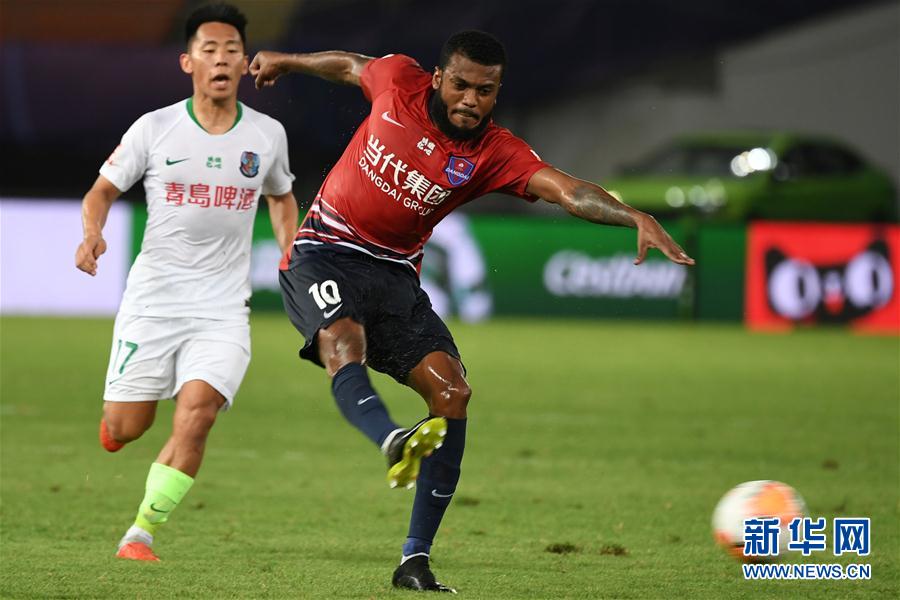 8月11日,重庆当代队球员西里诺(右)在比赛中射门。 当日,在2020赛季中国足球协会超级联赛第一阶段(苏州赛区)第四轮比赛中,重庆当代队以0比0战平青岛黄海青港队。 新华社记者 韩瑜庆 摄