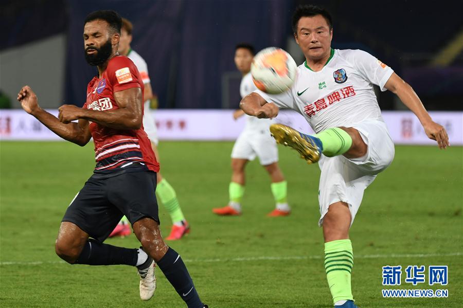 8月11日,青岛黄海青港队球员高翔(右)在比赛中大脚解围。 当日,在2020赛季中国足球协会超级联赛第一阶段(苏州赛区)第四轮比赛中,重庆当代队以0比0战平青岛黄海青港队。 新华社记者 韩瑜庆 摄