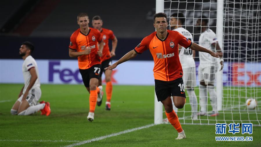 8月11日,顿涅茨克矿工队球员莫赖斯(前)在比赛中进球后庆祝。 当日,在德国盖尔森基兴进行的2019-2020赛季欧罗巴联赛四分之一决赛中,乌超顿涅茨克矿工队以4比1战胜瑞超巴塞尔队,晋级半决赛。 新华社发(欧足联供图)