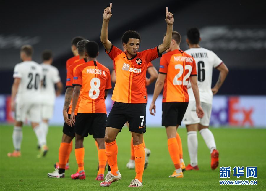 8月11日,顿涅茨克矿工队球员泰森(前)在比赛中庆祝进球。 当日,在德国盖尔森基兴进行的2019-2020赛季欧罗巴联赛四分之一决赛中,乌超顿涅茨克矿工队以4比1战胜瑞超巴塞尔队,晋级半决赛。 新华社发(欧足联供图)