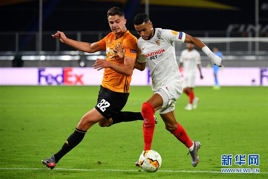 8月11日,塞维利亚队球员恩·尼西里(右)在比赛中与狼队球员登东克尔拼抢。 当日,在德国杜伊斯堡进行的2019-2020赛季欧罗巴联赛四分之一决赛中,西甲塞维利亚队以1比0战胜英超狼队,晋级半决赛。 新华社发(欧足联供图)