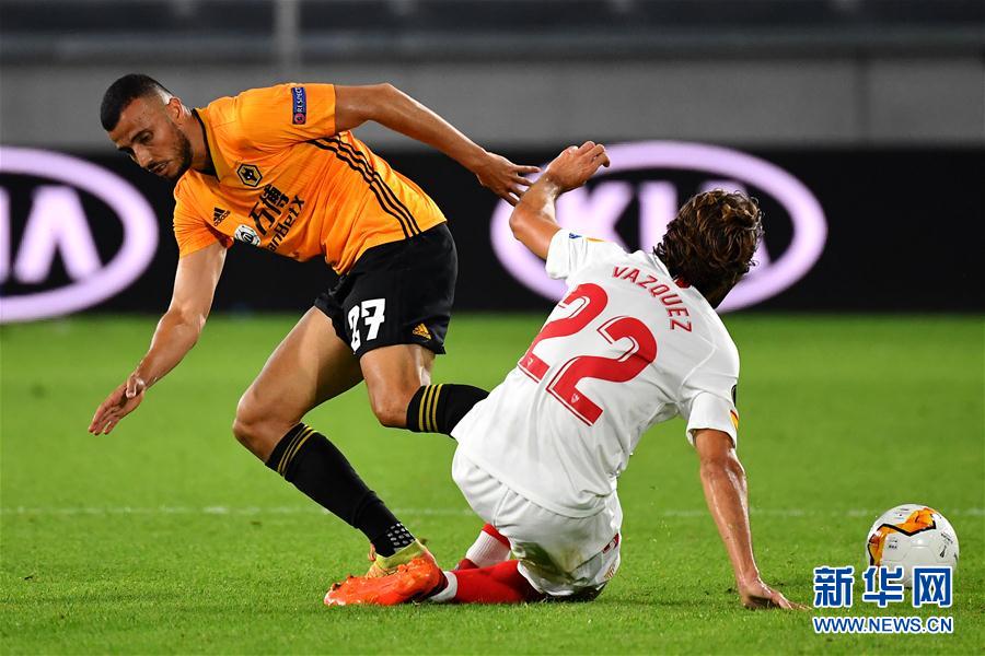 8月11日,塞维利亚队球员巴斯克斯(右)在比赛中与狼队球员赛斯拼抢。 当日,在德国杜伊斯堡进行的2019-2020赛季欧罗巴联赛四分之一决赛中,西甲塞维利亚队以1比0战胜英超狼队,晋级半决赛。 新华社发(欧足联供图)