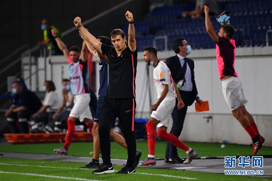 8月11日,塞维利亚队主教练洛佩特吉(前)在比赛后庆祝。 当日,在德国杜伊斯堡进行的2019-2020赛季欧罗巴联赛四分之一决赛中,西甲塞维利亚队以1比0战胜英超狼队,晋级半决赛。 新华社发(欧足联供图)