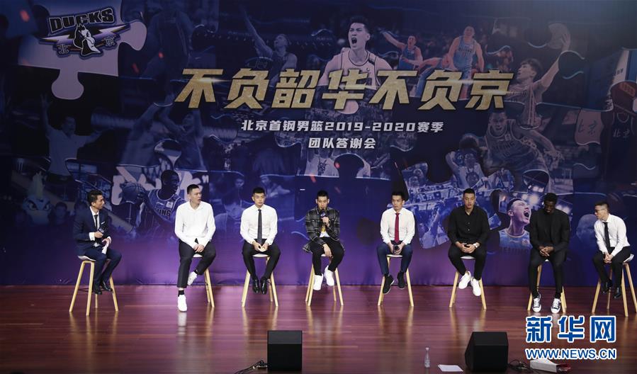 8月12日,北京首钢队球员林书豪(左四)在答谢会上回答记者提问。 当日,北京首钢队在首钢体育大厦举行2019-2020赛季球迷答谢会,感谢球迷在本赛季对球队的支持。 新华社记者 孟永民 摄