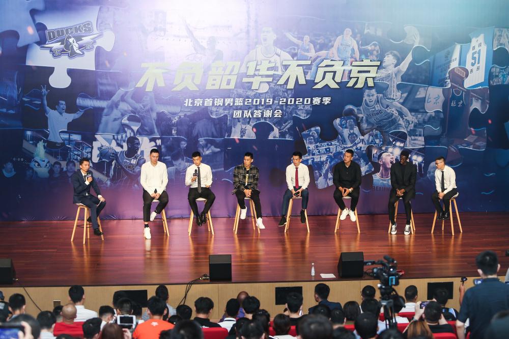 央视网消息:北京时间2020年8月12日,“北京首钢2019-2020赛季团队答谢会”在北京举行。代理教练解立彬、首钢球员林书豪、方硕、翟晓川等均着正装现身,与现场球迷亲切互动。