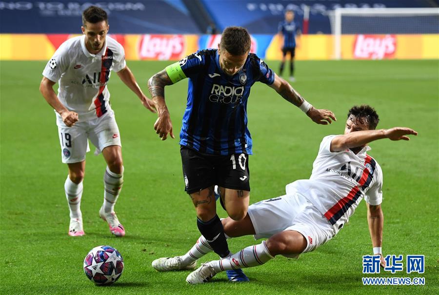 8月12日,亚特兰大队球员戈麦斯(中)和巴黎圣日耳曼队球员贝尔纳特(右)拼抢。 当日,在葡萄牙里斯本举行的2019-2020赛季欧冠联赛四分之一决赛中,法甲巴黎圣日耳曼队以2比1逆转战胜意甲亚特兰大队,晋级四强。 新华社/法新
