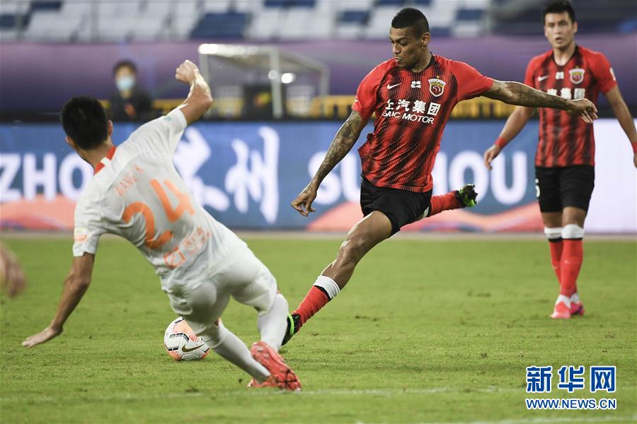 8月12日,上海上港队球员里卡多·洛佩斯(中)在比赛中射门。 当日,在2020赛季中国足球协会超级联赛第一阶段(苏州赛区)第四轮比赛中,上海上港队以2比1战胜武汉卓尔队。 新华社记者 韩瑜庆 摄