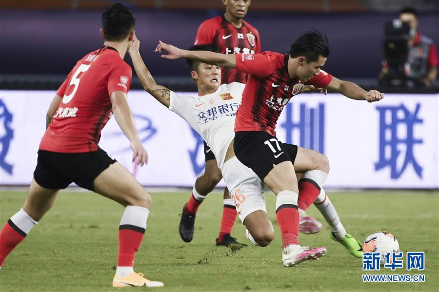 8月12日,上海上港队球员陈彬彬(右一)与武汉卓尔队球员刘云(右二)在比赛中拼抢。 当日,在2020赛季中国足球协会超级联赛第一阶段(苏州赛区)第四轮比赛中,上海上港队以2比1战胜武汉卓尔队。 新华社记者 韩瑜庆 摄