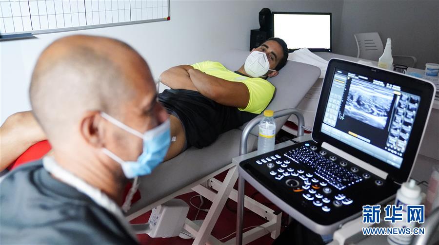 8月12日,格拉纳达队球员安赫尔·蒙托罗(后)正在体检。 当日,西甲球队格拉纳达队的球员在西班牙格拉纳达进行新赛季前的体检。在2019-2020赛季西班牙足球甲级联赛中,格拉纳达队列积分榜第七,取得下赛季欧罗巴联赛的一张入场券。 新华社发(格拉纳达队供图)