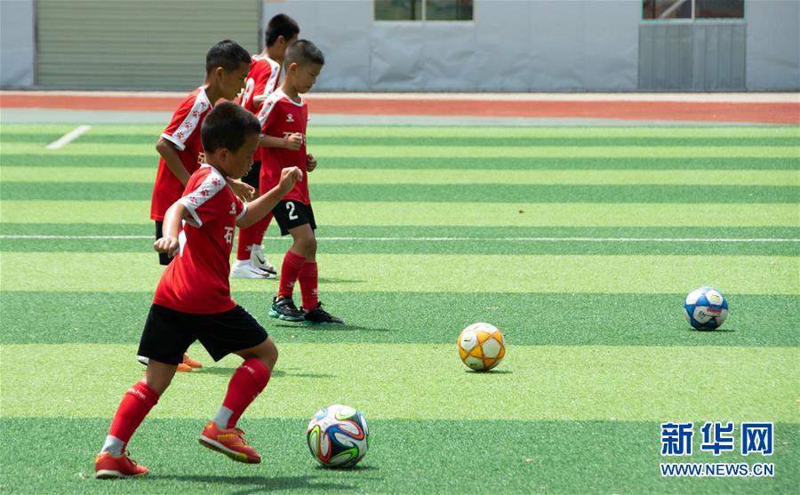 8月14日,在湖南省石门县第五完全小学校园内,足球队的孩子们在训练。 新华社记者 柳王敏 摄