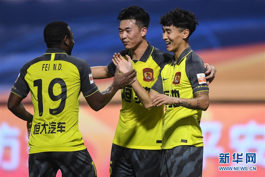 8月14日,广州恒大淘宝队球员韦世豪(右)进球后与队友费南多(左)庆祝。 当日,在2020赛季中国足球协会超级联赛第一阶段(大连赛区)第五轮比赛中,广州恒大淘宝队以3比1战胜河南建业队。 新华社记者 潘昱龙 摄
