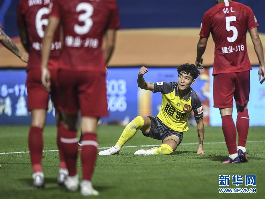 8月14日,广州恒大淘宝队球员韦世豪(右二)在比赛中制造点球后。 当日,在2020赛季中国足球协会超级联赛第一阶段(大连赛区)第五轮比赛中,广州恒大淘宝队以3比1战胜河南建业队。 新华社记者 潘昱龙 摄