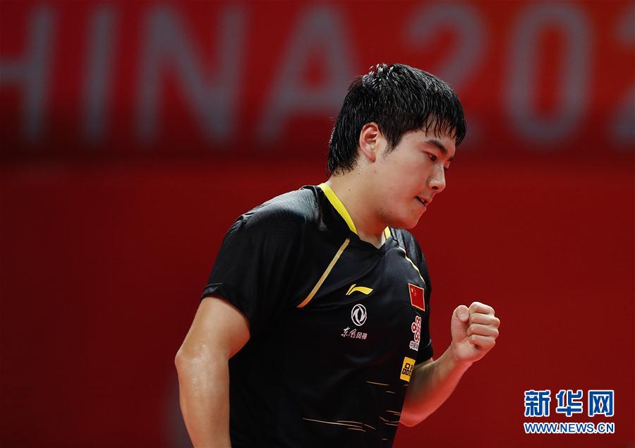 8月14日,梁靖崑在比赛中庆祝得分。 当日,在海南陵水举行的中国乒乓球队奥运模拟赛男子单打决赛中,梁靖崑以4比2战胜王楚钦,夺得冠军。 新华社发(边玉翔 摄)