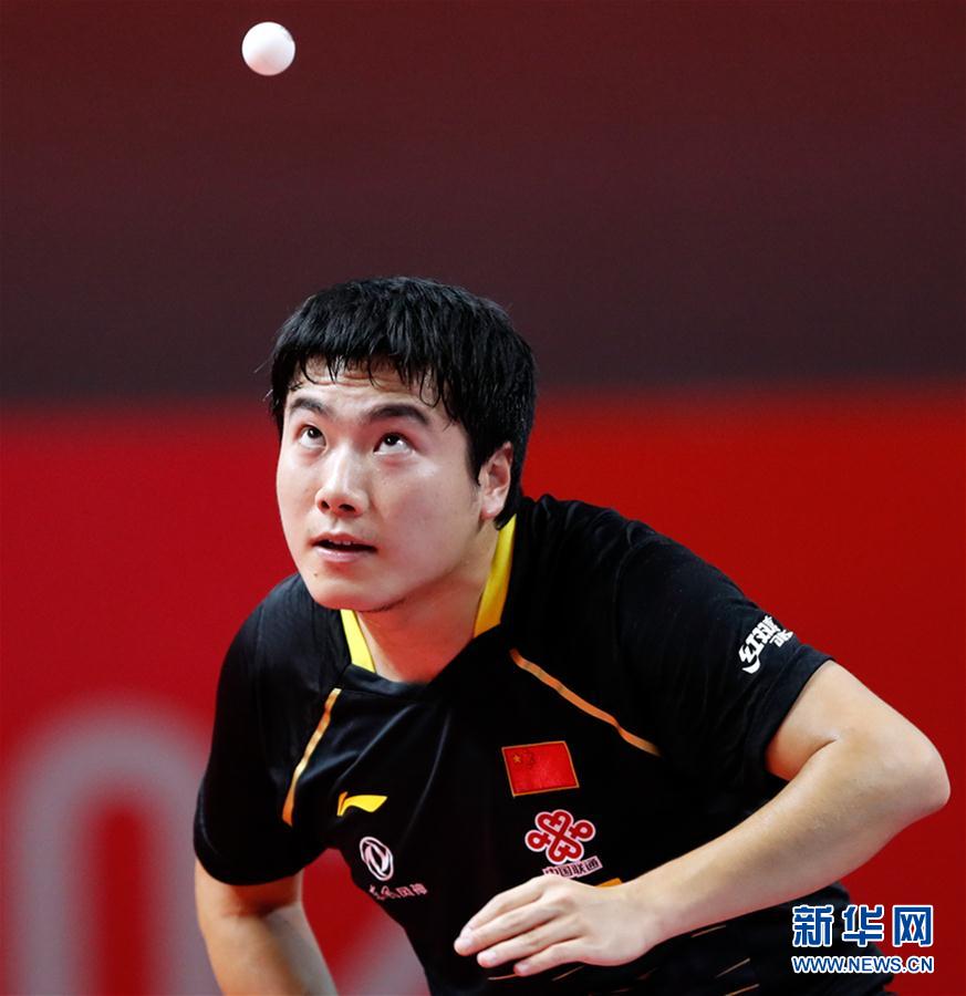 8月14日,梁靖崑在比赛中发球。 当日,在海南陵水举行的中国乒乓球队奥运模拟赛男子单打决赛中,梁靖崑以4比2战胜王楚钦,夺得冠军。 新华社发(边玉翔 摄)