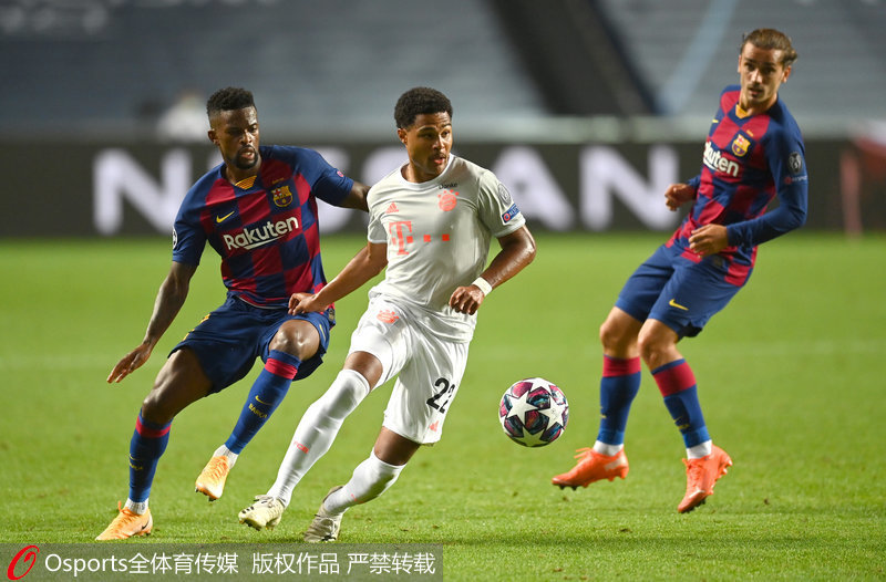 人民网北京8月15日电 北京时间8月15日3:00,2019/20赛季欧冠四分之一决赛第三场比赛在拜仁和巴萨之间展开。上半场拜仁狂进4球,阿拉巴乌龙送巴萨1球;下半场苏亚雷斯先进1球,随后拜仁又狂进4球。最终,巴萨以2:8被拜仁血洗,以一场令人瞠目的惨烈失败被淘汰出局。
