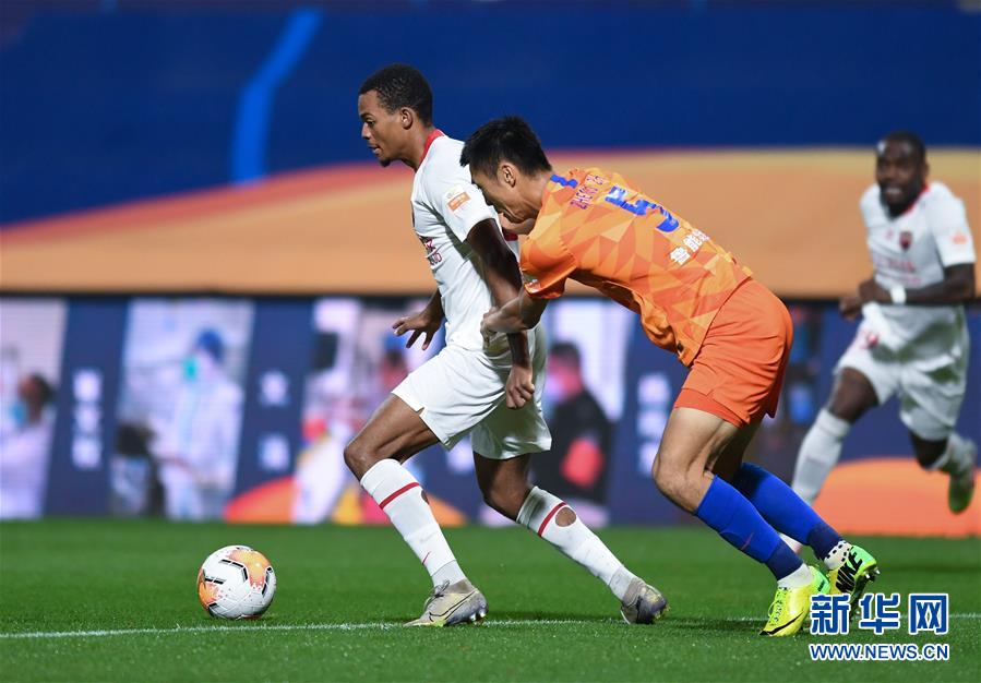 8月15日,深圳佳兆业队球员普雷西亚多(左)在比赛中带球进攻。 当日,在2020赛季中国足球协会超级联赛第一阶段(大连赛区)第五轮比赛中,山东鲁能泰山队以2比0战胜深圳佳兆业队。 新华社记者 龙雷 摄