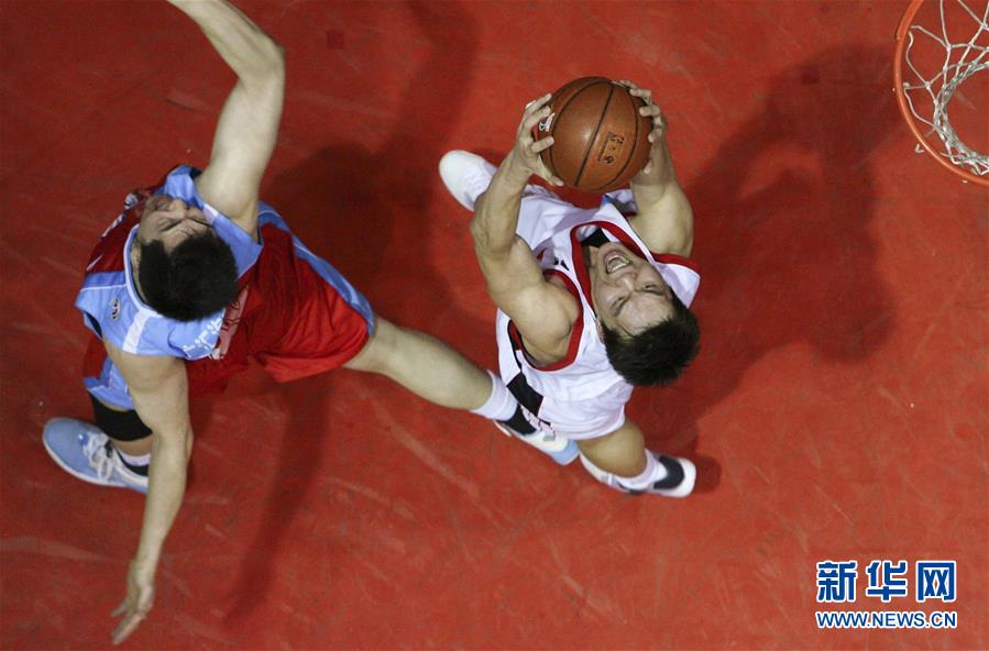 2009年5月3日,在2008-2009赛季CBA总决赛第五场比赛中,广东东莞银行队主场以106比95战胜新疆广汇队,夺得冠军。这是广东东莞银行队球员朱芳雨(右)在比赛中拼抢。新华社记者孟永民摄