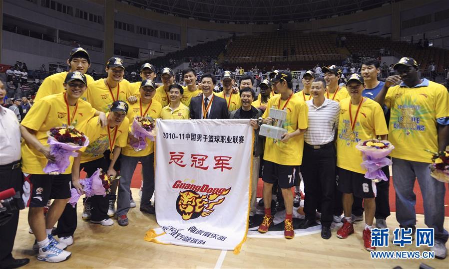 2011年4月27日,在2010-2011赛季CBA总决赛第六场比赛中,广东东莞银行队客场以103比93战胜新疆广汇汽车队,夺得冠军。这是广东东莞银行队球员庆祝夺冠。新华社记者赵戈摄