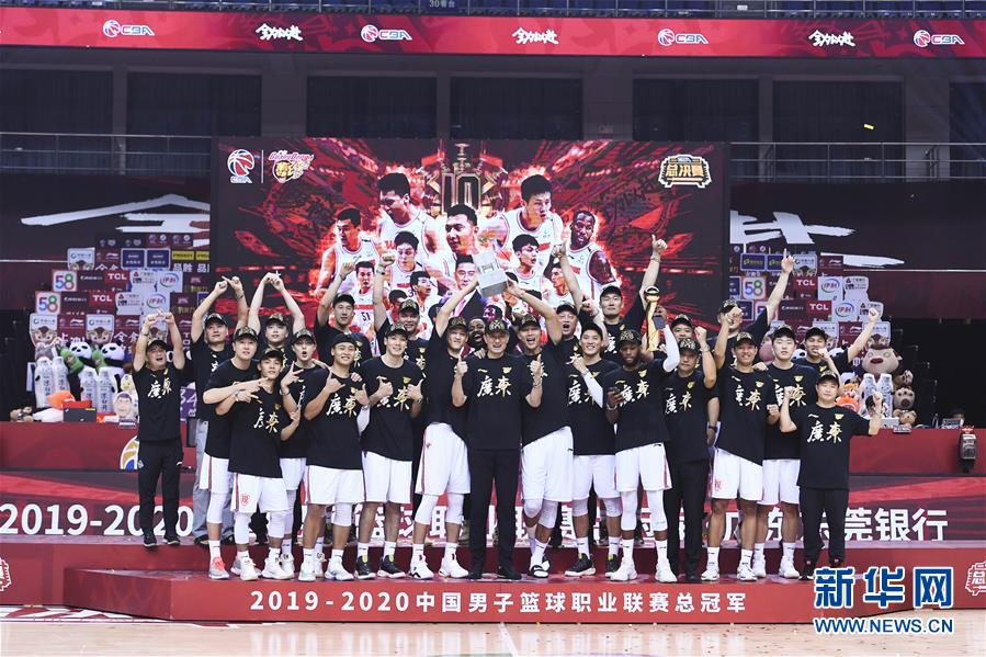 2020年8月15日,在2019-2020赛季中国男子篮球职业联赛(CBA)总决赛第三场比赛中,广东东莞银行队以123比115战胜辽宁本钢队,夺得冠军。这是广东东莞银行队在颁奖仪式上庆祝夺冠。新华社记者朱峥摄