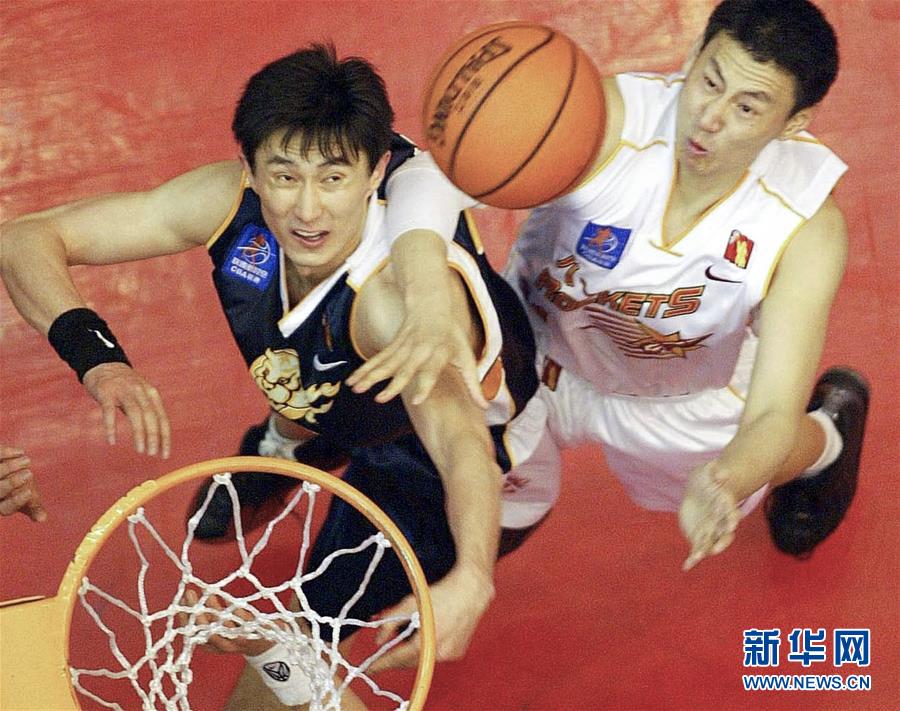 2004年3月3日,在2003-2004赛季CBA总决赛第四场比赛中,广东宏远队客场以98比84战胜八一队,夺得冠军。这是广东队球员杜锋(左)与八一队球员李楠在争抢篮板球。新华社记者李岳摄