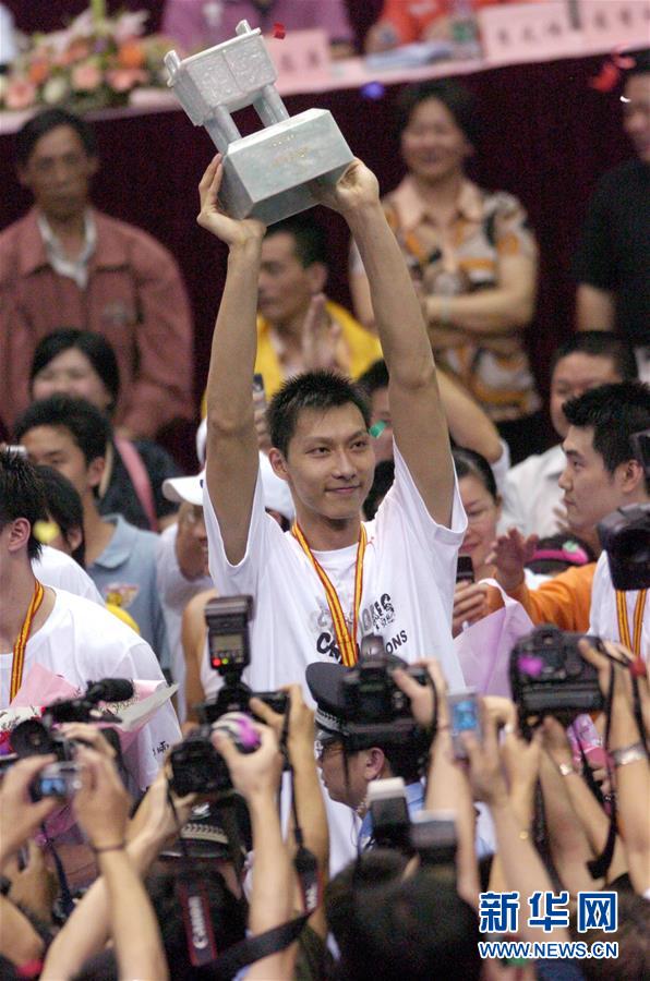 2006年4月19日,在2005-2006赛季CBA总决赛第五场比赛中,广东宝玛仕队主场以88比81战胜八一双鹿队,夺得冠军。这是广东宝玛仕队球员易建联(中)举起冠军鼎。新华社发
