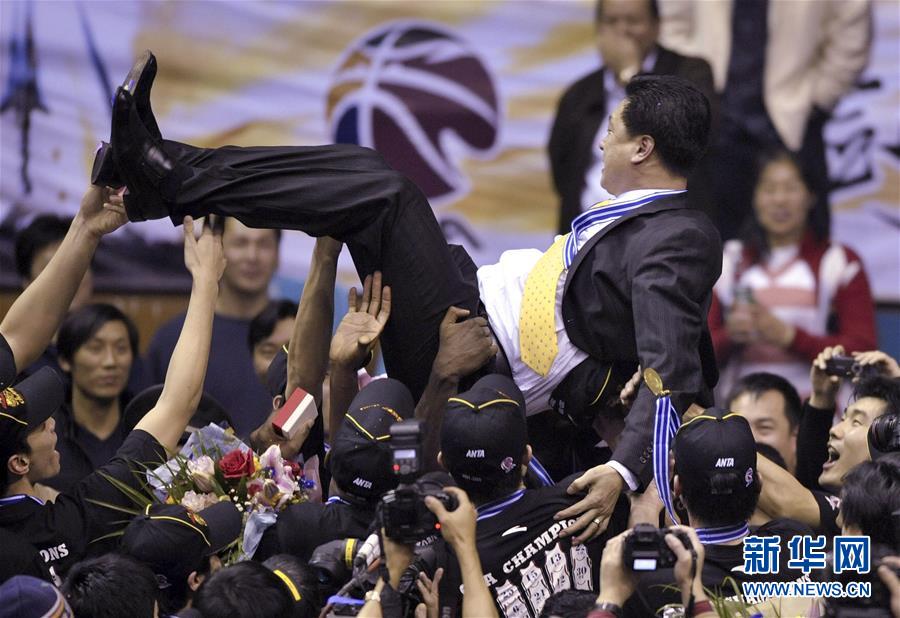 2008年2月22日,在2007-2008赛季CBA总决赛第五场比赛中,广东宏远队主场以90比81战胜辽宁盼盼队,夺得冠军。这是广东宏远队主教练李春江被球员高高抛起庆祝。新华社记者刘大伟摄