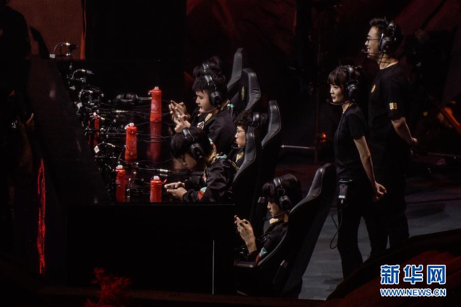 8月16日,DYG战队队员在比赛中。 当日,在北京凯迪拉克中心举行的2020王者荣耀世界冠军杯总决赛中,TS豚首战队以4比3战胜DYG战队,捧起金凤凰杯。 新华社记者 彭子洋 摄