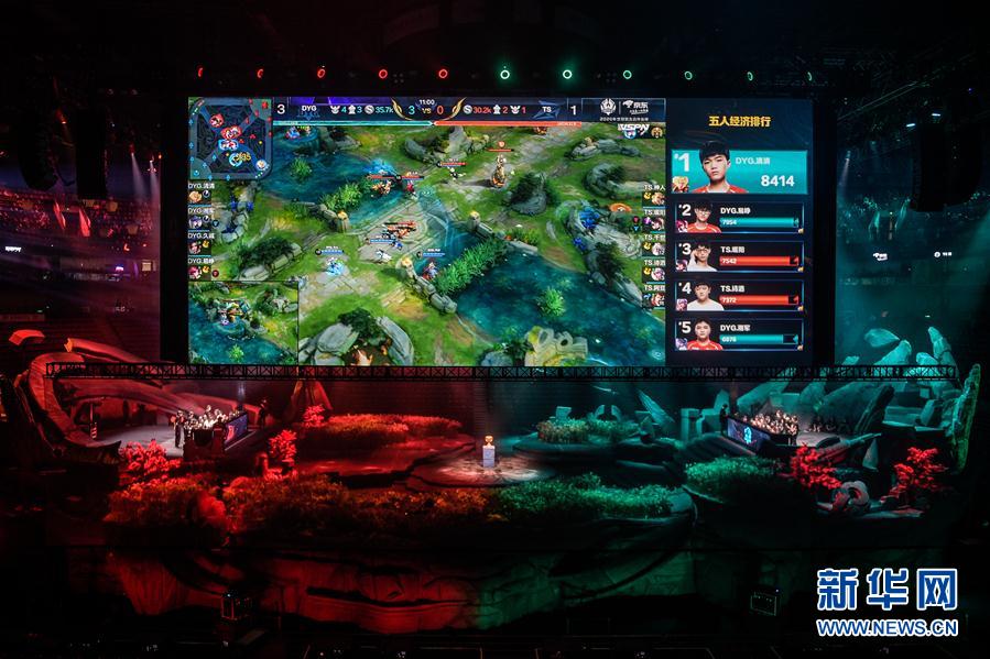 这是8月16日拍摄的比赛现场。 当日,在北京凯迪拉克中心举行的2020王者荣耀世界冠军杯总决赛中,TS豚首战队以4比3战胜DYG战队,捧起金凤凰杯。 新华社记者 彭子洋 摄