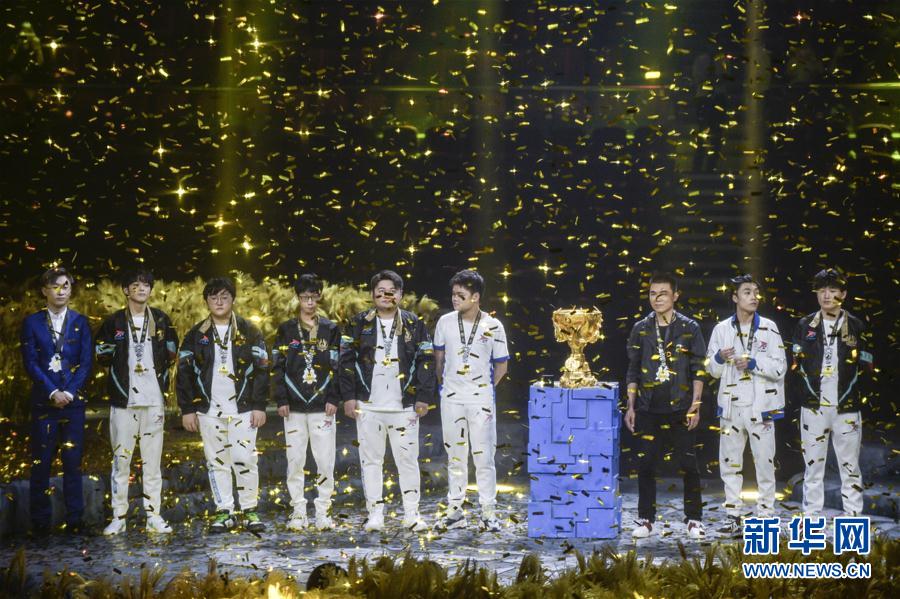 8月16日,TS豚首战队队员及教练张凯(左一)与金凤凰杯合影。 当日,在北京凯迪拉克中心举行的2020王者荣耀世界冠军杯总决赛中,TS豚首战队以4比3战胜DYG战队,捧起金凤凰杯。 新华社记者 彭子洋 摄