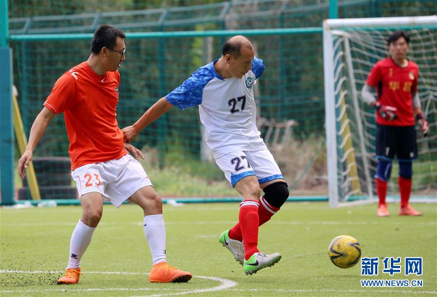 图为2019年8月24日,王勇(中)代表“快乐78”队参加河北华夏幸福球迷联赛。(资料照片)新华社发(周洋 摄)