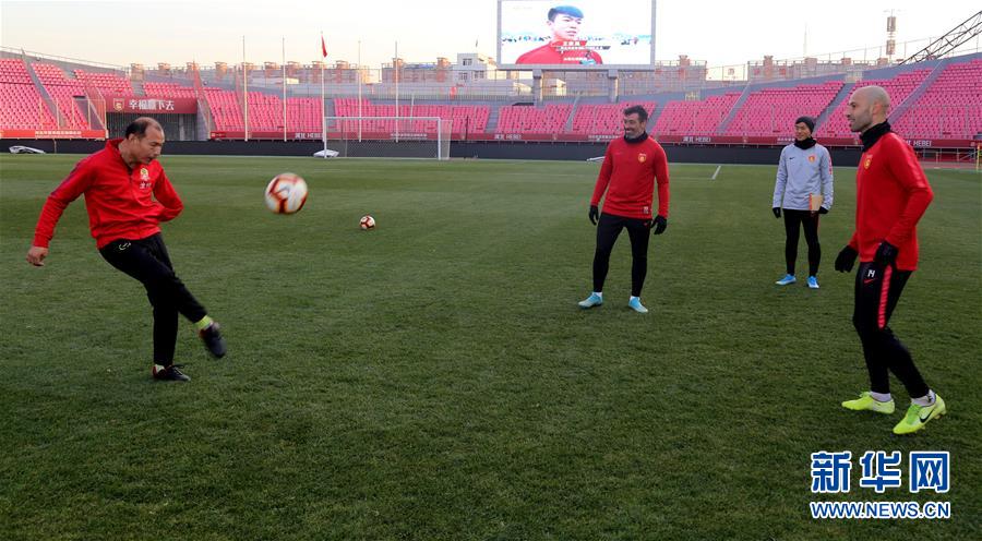 图为2019年11月26日,王勇(左一)和马斯切拉诺(右一)、拉维奇(左二)在传球训练。(资料照片)新华社发(周洋 摄)