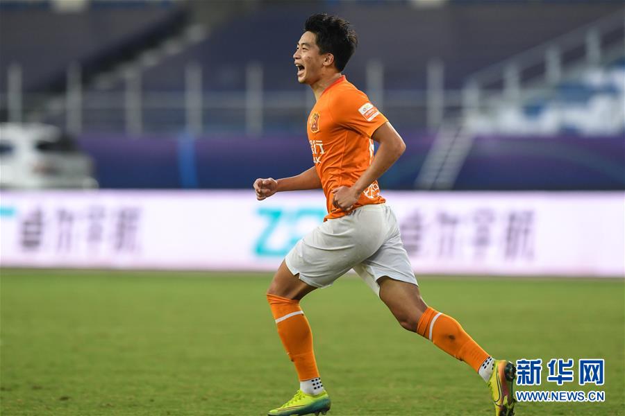 8月17日,武汉卓尔队球员胡靖航在比赛中庆祝进球。 当日,在2020赛季中国足球协会超级联赛第一阶段(苏州赛区)第五轮比赛中,武汉卓尔队对阵重庆当代队。 新华社记者李博摄