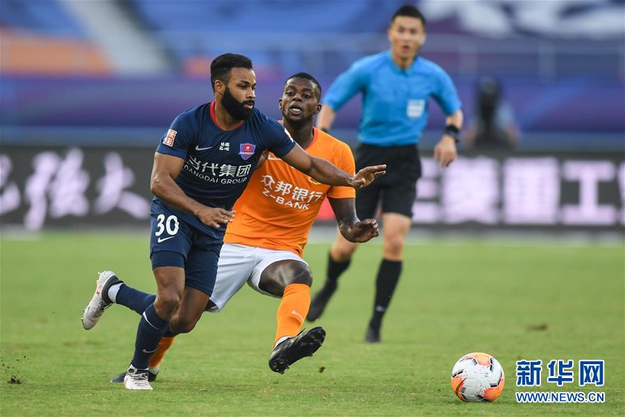 8月17日,重庆当代队球员费尔南迪尼奥(左)在比赛中突破。 当日,在2020赛季中国足球协会超级联赛第一阶段(苏州赛区)第五轮比赛中,武汉卓尔队对阵重庆当代队。 新华社记者李博摄