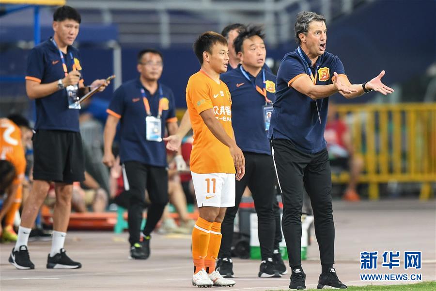 8月17日,武汉卓尔队主教练何塞(右一)在场边指挥。 当日,在2020赛季中国足球协会超级联赛第一阶段(苏州赛区)第五轮比赛中,武汉卓尔队以2比0战胜重庆当代队。 新华社记者李博摄