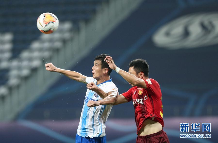 8月17日,河北华夏幸福队球员潘喜民(右)在比赛中与天津泰达队球员肖智争顶。 当日,在2020赛季中国足球协会超级联赛第一阶段(苏州赛区)第五轮比赛中,河北华夏幸福队以2比0战胜天津泰达队。 新华社记者杨磊摄