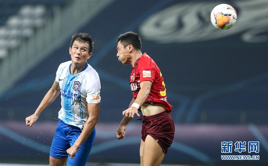 8月17日,河北华夏幸福队球员潘喜民(右)在比赛中与天津泰达队球员肖智争顶。 当日,在2020赛季中国足球协会超级联赛第一阶段(苏州赛区)第五轮比赛中,河北华夏幸福队以2比0战胜天津泰达队。 新华社记者杨磊摄