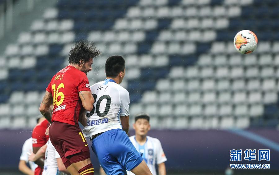 8月17日,河北华夏幸福队球员高拉特(左)在比赛中头球破门。 当日,在2020赛季中国足球协会超级联赛第一阶段(苏州赛区)第五轮比赛中,河北华夏幸福队对阵天津泰达队。 新华社记者杨磊摄