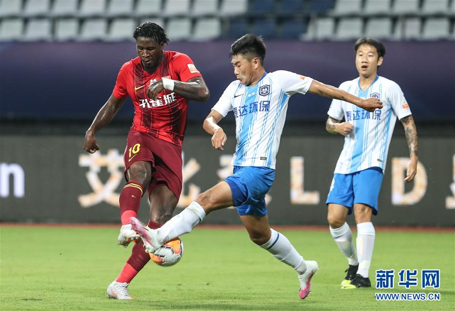 8月17日,河北华夏幸福队球员马尔考(左)在比赛中进攻。 当日,在2020赛季中国足球协会超级联赛第一阶段(苏州赛区)第五轮比赛中,河北华夏幸福队对阵天津泰达队。 新华社记者杨磊摄