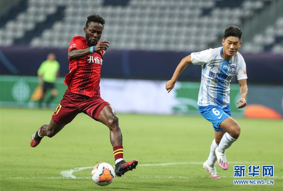 8月17日,河北华夏幸福队球员图雷(左)在比赛中进攻。 当日,在2020赛季中国足球协会超级联赛第一阶段(苏州赛区)第五轮比赛中,河北华夏幸福队对阵天津泰达队。 新华社记者杨磊摄