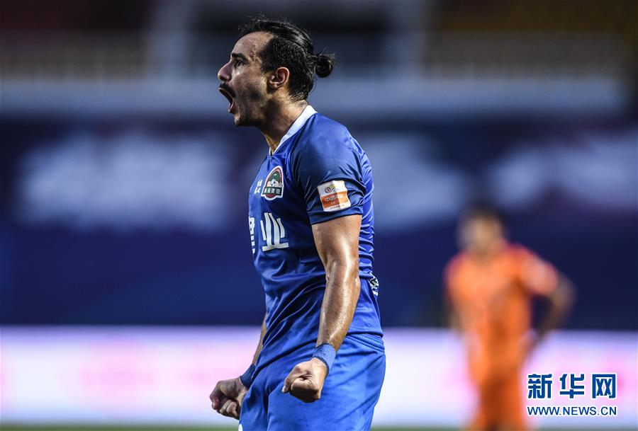 8月19日,河南建业队球员多拉多进球后庆祝。 当日,在2020中国平安中国足球协会超级联赛(大连赛区)第六轮比赛中,山东鲁能泰山队对阵河南建业队。 新华社记者潘昱龙摄