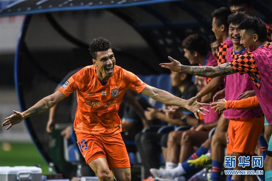 8月19日,山东鲁能泰山队球员莫伊塞斯(左)进球后与场边队友庆祝。 当日,在2020中国平安中国足球协会超级联赛(大连赛区)第六轮比赛中,山东鲁能泰山队对阵河南建业队。 新华社记者潘昱龙摄