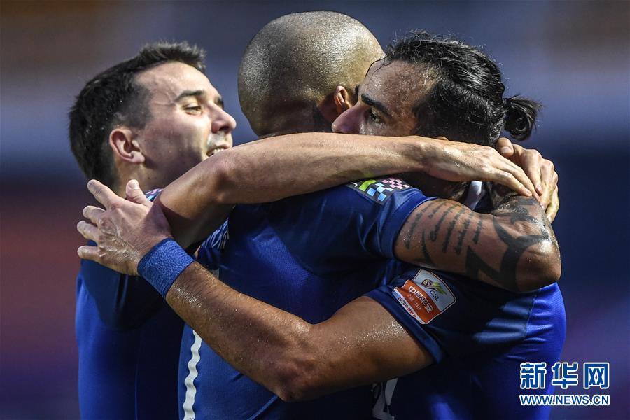 8月19日,河南建业队球员多拉多(右)进球后庆祝。 当日,在2020中国平安中国足球协会超级联赛(大连赛区)第六轮比赛中,山东鲁能泰山队对阵河南建业队。 新华社记者潘昱龙摄