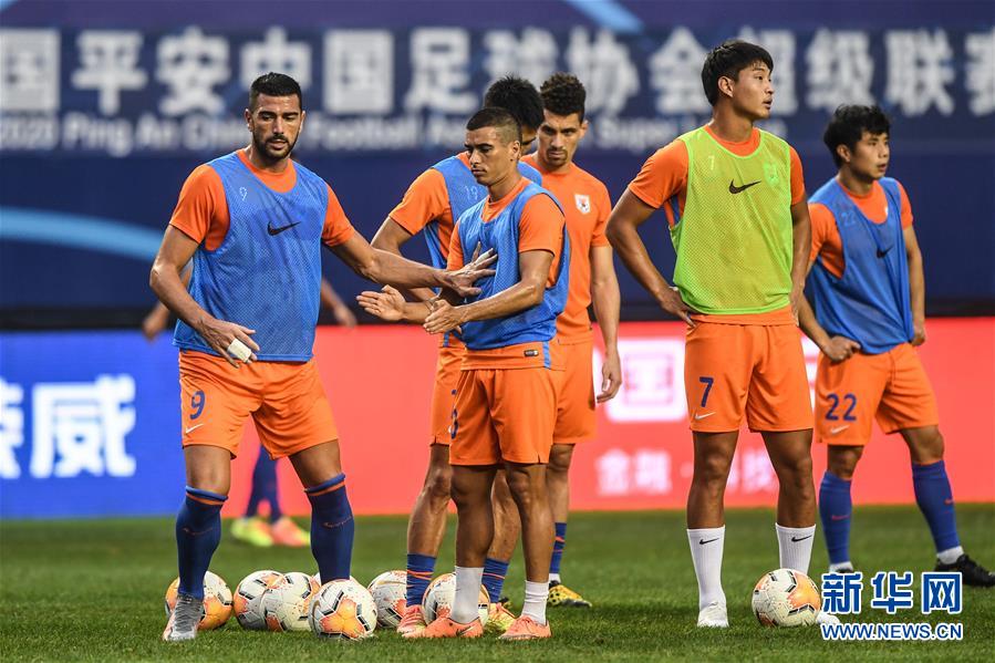 8月19日,山东鲁能泰山队球员佩莱(左一)与队友莱昂纳多(左二)在赛前训练中。 当日,在2020赛季中国足球协会超级联赛第一阶段(大连赛区)第六轮比赛中,山东鲁能泰山队迎战河南建业队。 新华社记者潘昱龙摄