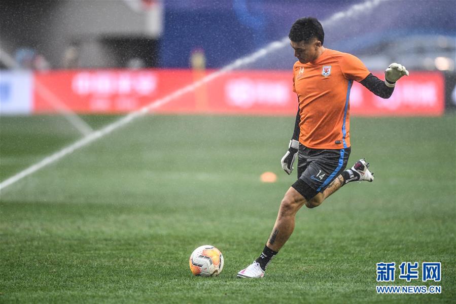 8月19日,山东鲁能泰山队门将王大雷在赛前训练中。 当日,在2020赛季中国足球协会超级联赛第一阶段(大连赛区)第六轮比赛中,山东鲁能泰山队迎战河南建业队。 新华社记者潘昱龙摄