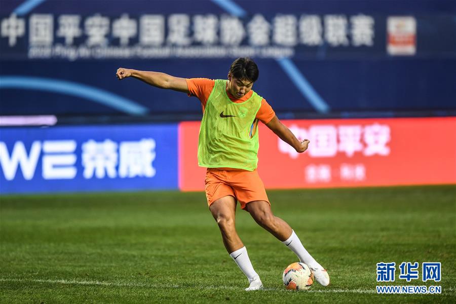 8月19日,山东鲁能泰山队球员郭田雨在赛前训练中。 当日,在2020赛季中国足球协会超级联赛第一阶段(大连赛区)第六轮比赛中,山东鲁能泰山队迎战河南建业队。 新华社记者潘昱龙摄