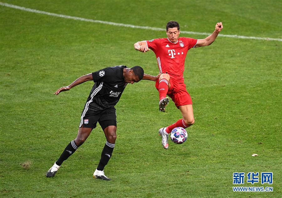 8月19日,拜仁慕尼黑队球员莱万多夫斯基(右)在比赛中拼抢。 当日,在葡萄牙里斯本举行的2019-2020赛季欧洲足球冠军联赛半决赛中,德甲拜仁慕尼黑队以3比0战胜法甲里昂队,挺进决赛。 新华社发(欧足联供图)