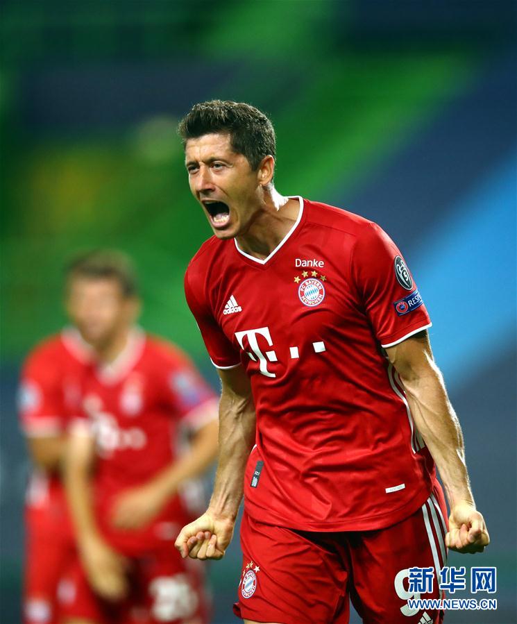 8月19日,拜仁慕尼黑队球员莱万多夫斯基庆祝进球。 当日,在葡萄牙里斯本举行的2019-2020赛季欧洲足球冠军联赛半决赛中,德甲拜仁慕尼黑队以3比0战胜法甲里昂队,挺进决赛。 新华社发(欧足联供图)